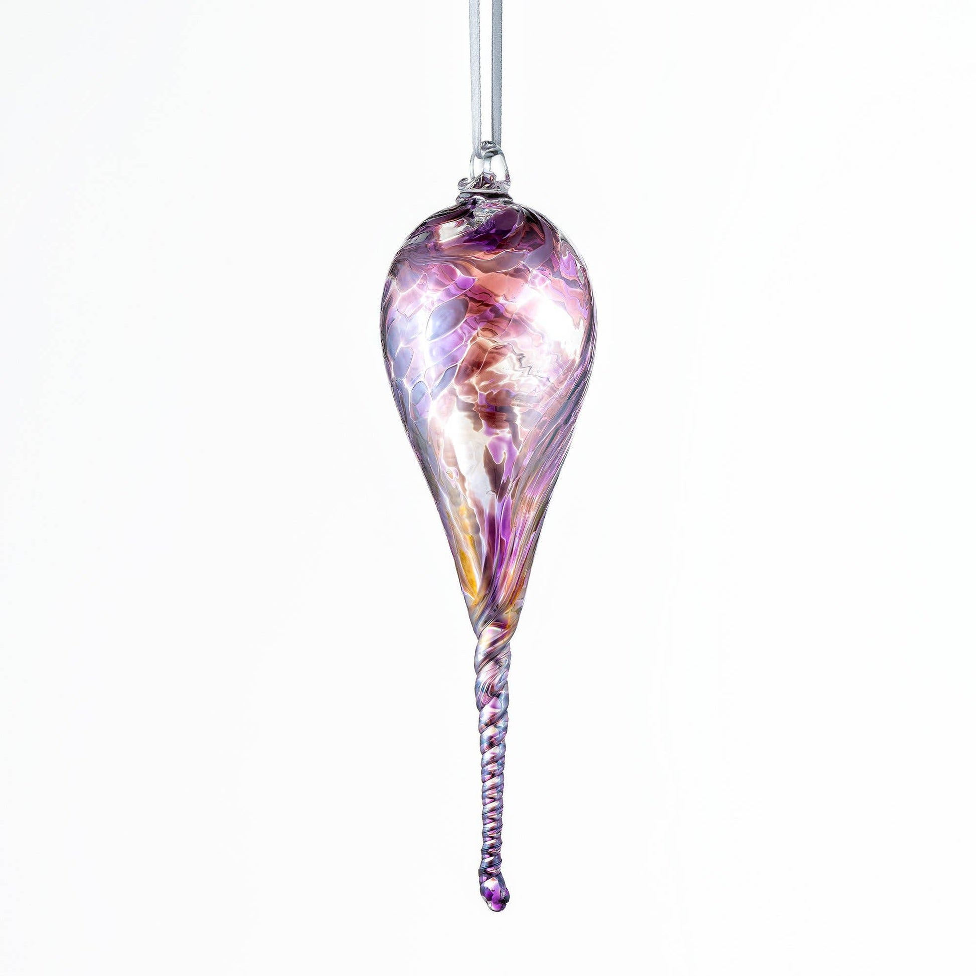 This stunning hand-blown glass ornament measures approximately 6.3 inches (16 cm). Its graceful, elongated shape creates a beautiful focal point in any window, capturing and scattering light across the room.